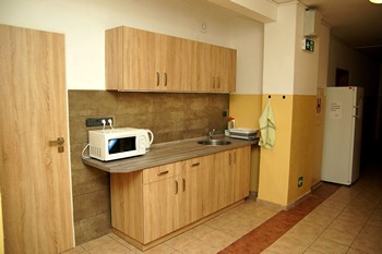 Na každém ubytovacím patře jsou ohřívací kouty s nádobím, mikrovlnnou troubou a varnou konvicí.